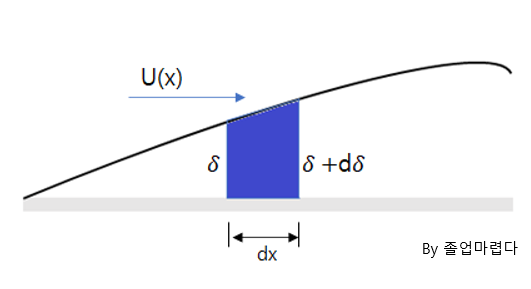 유체가 흐르다 수평의 평판과 만나게 되면 평판의 점성에의한 마찰로 흐르던 속도가 줄게되고 이에따라 다음과 같은 속도 profile을 갖게 됩니다.